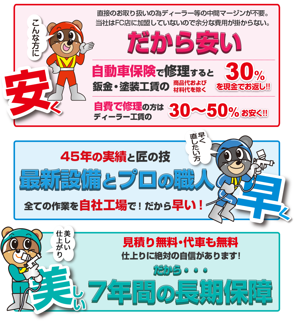 鈑金塗装専門工場は、ほとんどが各ディーラー工場等の下請けのため、工賃の30%がその中間に入ったディーラーさん等のマージン(手数料)となります。でも、その中間を省いて当社へ直接依頼くだされば、その30%分をお客様に現金でお返しできる、ということなのです。